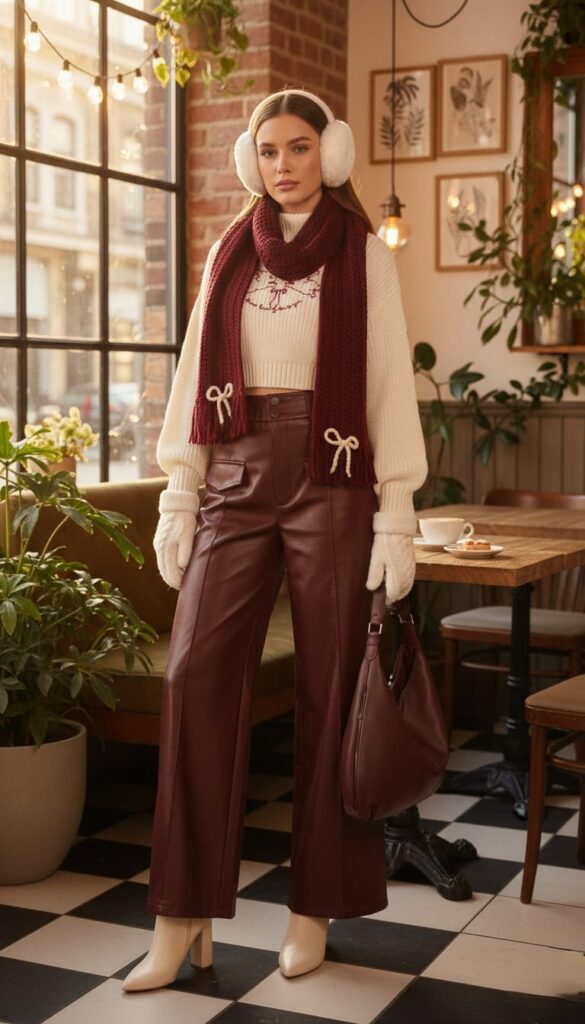 If you want to feel like a walking marshmallow (but a fashionable one), this is your look. It combines rich textures with practical warmth. We are pairing deep maroon leather pants with a chunky cream knit sweater and—the star of the show—a matching maroon scarf with adorable bow details.