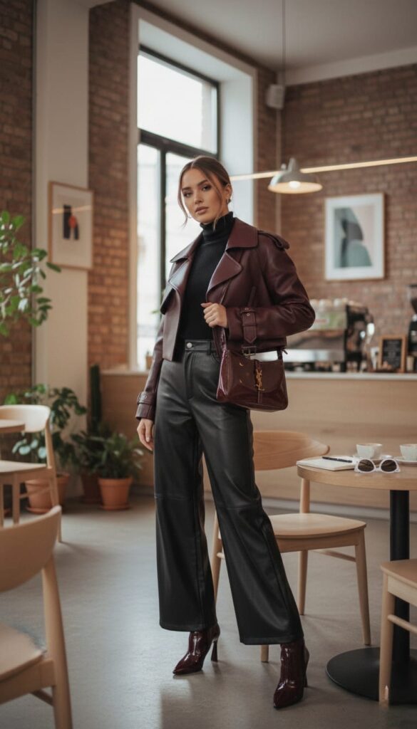 cafe outfits (3).webp): Edgy maroon leather biker jacket paired with black wide-leg leather pants. - Image 4 (