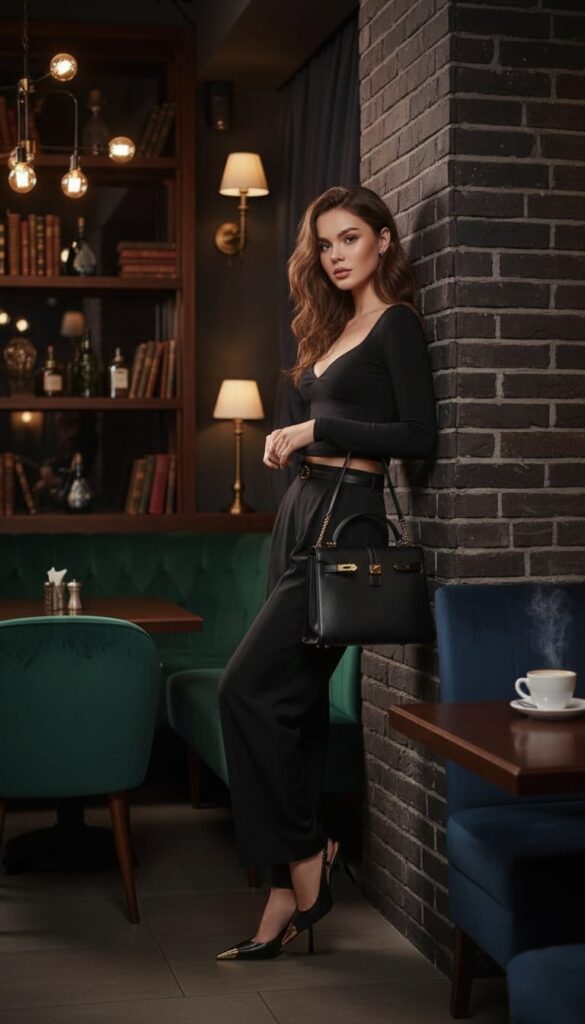 cafe outfits (9).webp): Elegant all-black look with scoop neck long sleeve top and tailored trousers.